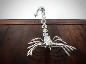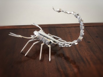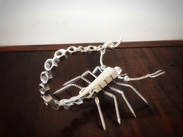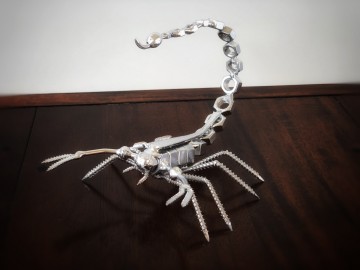 Veel mensen voelen angst en verwondering tegelijk als ze naar een schorpioen kijken. Mensen worden alleen blij als ze naar onze figuur van een schorpioen kijken. Het unieke ontwerp van de moeren, schroeven, schroeven en bestekdelen geeft het een uniek karakter en maakt het een klein kunstwerkje. Aandacht voor elk detail maakt het een prachtig figuur dat een prachtige decoratie van uw kamer zal zijn. En elke schorpioenliefhebber zou zo'n cadeau wel willen krijgen. En mensen van het sterrenbeeld Schorpioen zullen blij zijn met zo'n geschenk.