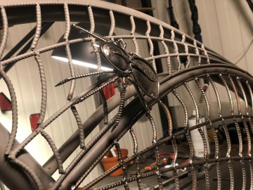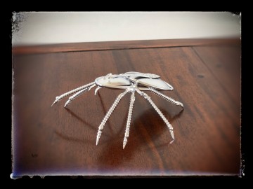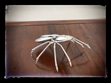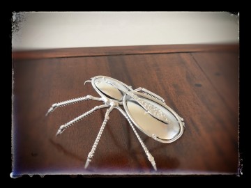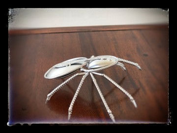 Een prachtig beeld van een spin gemaakt van antieke lepels, staven en schroeven.
